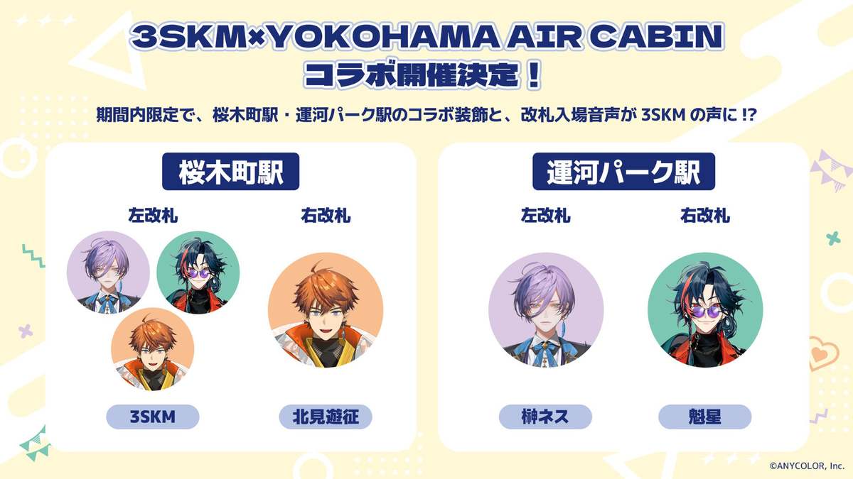 加えて、都市型ロープウェイ「YOKOHAMA AIR CABIN」との連動企画も実施。改札通過時の音声が特別仕様になるなど、移動中もコラボの世界観に浸ることができる。横浜の美しい景観とともに、3SKMのメンバーと過ごす特別な初夏を存分に満喫できそうだ。